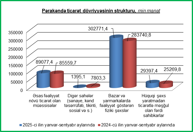 2025-ci ilin yanvar-sentyabr aylarında pərakəndə ticarət şəbəkələrində istehlak malları satışının 78,2 faizi və ya 330451,8 min manatı ərzaq məhsulları, içkilər və tütün məmulatları, 21,8 faizi və ya 92189,5 min manatı isə qeyri-ərzaq mallarının payına düşmüşdür. 2025-ci ilin yanvar-sentyabr aylarında əsas fəaliyyəti pərakəndə ticarət olan şəbəkələrdən 89077,4 min manatlıq əmtəə satılmış və digər sahələr (sənaye, kənd təsərrüfatı, tikinti, sosial və s.) üzrə satışın məbləği 1395,1 min manat olmuşdur. Fərdi sahibkarlar, bazar və yarmarkalar üzrə isə satılmış malların məbləği 332168,8 min manat təşkil etmiş və 2024-cü ilin yanvar-sentyabr ayları ilə müqayisədə 2,6 faiz çox olmuşdur.