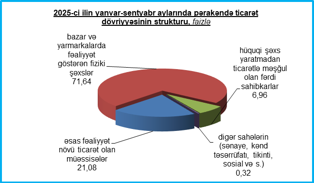2025-ci ilin yanvar-sentyabr aylarında hüquqi şəxslər üzrə pərakəndə ticarət dövriyyəsinin 0,15 faizi dövlət və 99,85 faizi isə qeyri-dövlət müəssisələrinin payına düşmüşdür.