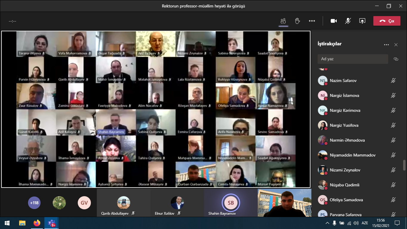 “Microsoft Teams” platforması üzərindən online formatda keçirilən görüşdə rektor 2020/2021-ci tədris ilinin payız imtahan sessiyasının müvəffəqiyyətlə başa çatması münasibətilə universitet kollektivini təbrik edib və elmi-pedaqoji fəaliyyətlərində onlara uğurlar arzulayıb.